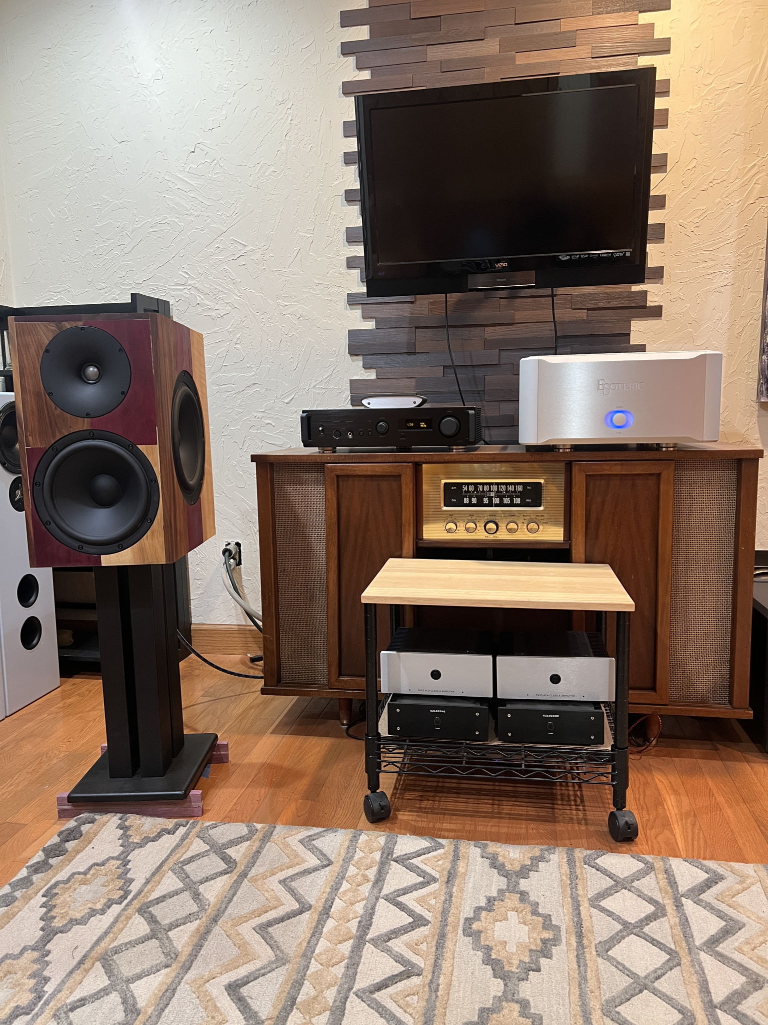 2 way Beryllium Waveguided Satori tweeter, 10" Satori bass driver. 11" SB Acoustics passive radiator. F3 response of 33hz.