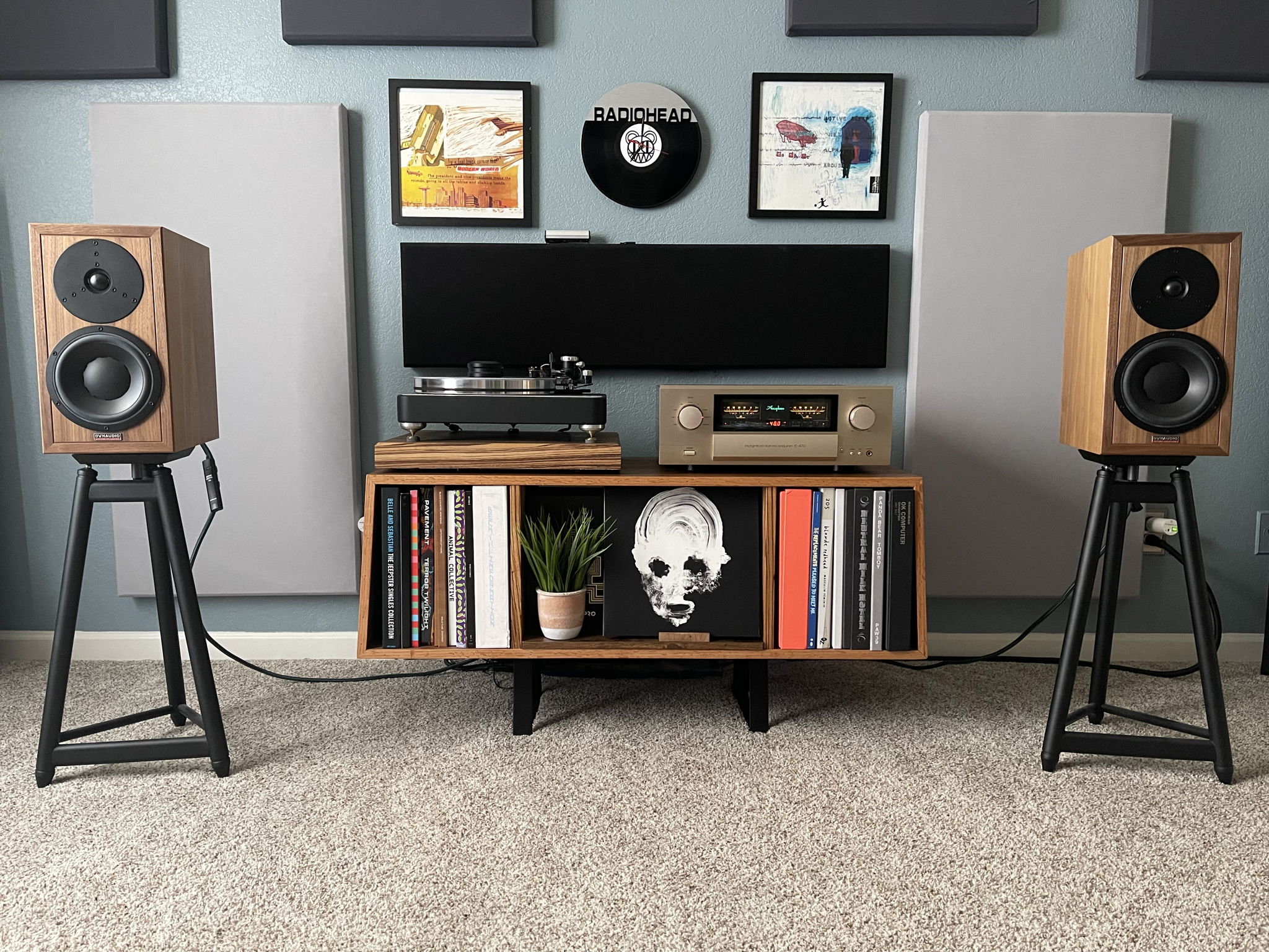 Great looking system - I had the Heritage Specials and they are a wonderful sounding speaker. I guess one thing for aesthetics might be to buy the Dynaudio Speaker stands as they, to my eye at least, would look cleaner than the tripods.