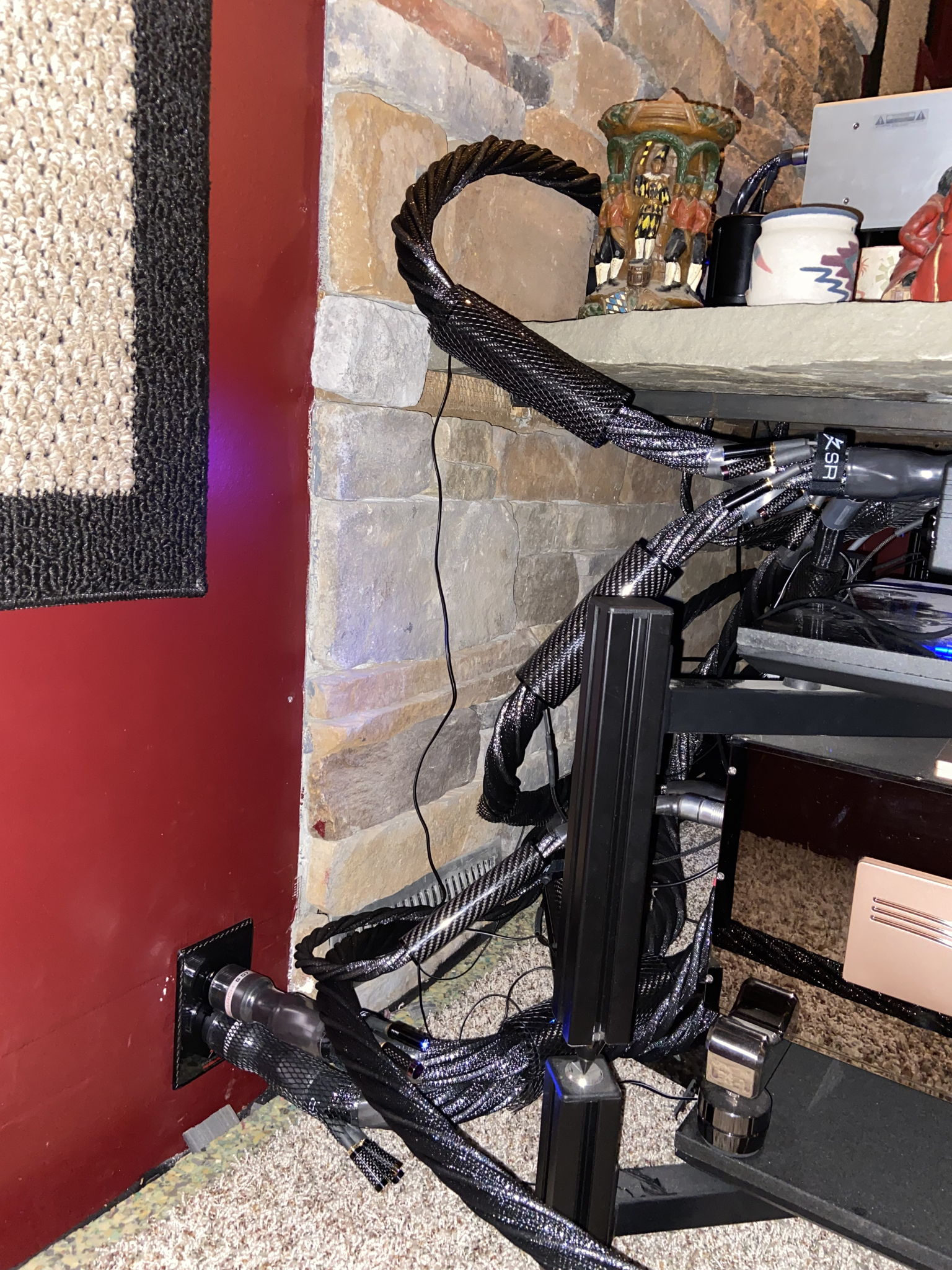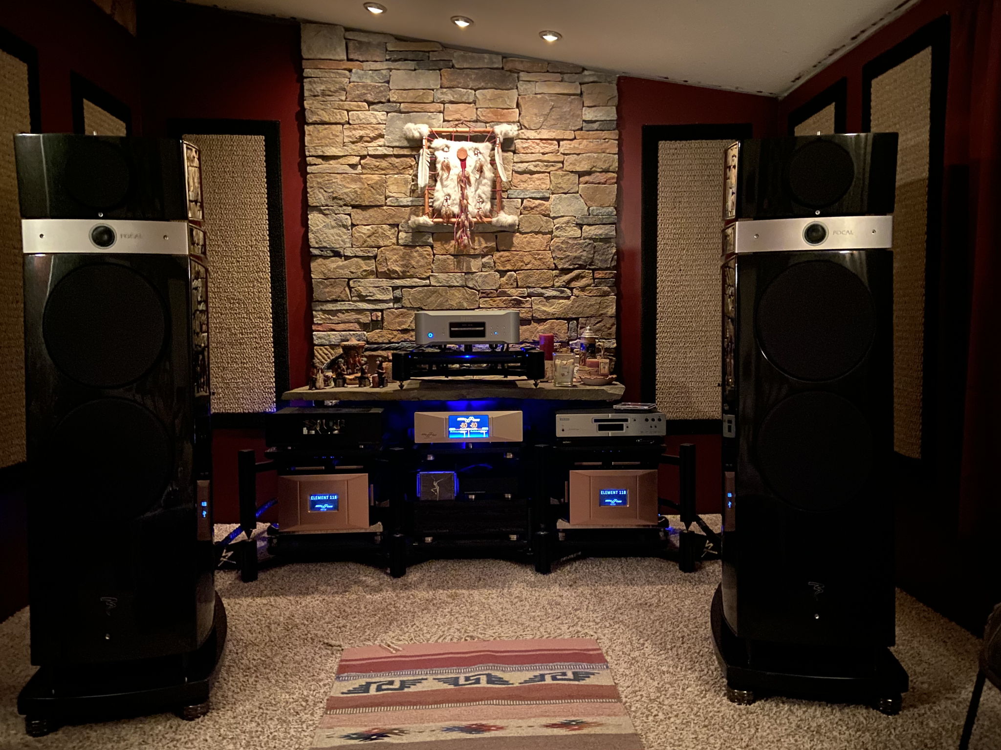 The wall treatments are basically hallway runners and door mats. There is a dense foam rubber backing and theyāre about 3/4ā thick. They help tremendously. They help Absorb wall vibrations and high frequency reflections. I also have larger decorative carpeting on the back wall.Ā