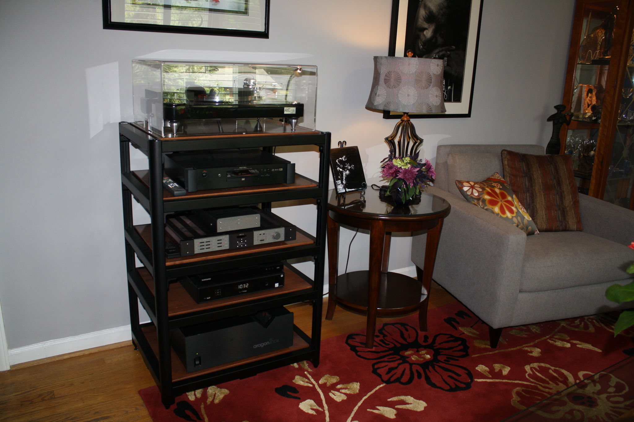 A bit old school, but no apologies. Everything has provided me much joy and most is recently rebuilt. All new tweeters and foam for the Mirage drivers, rebuilt KRC-2 with new caps, re-worked KPE, and cleaned up Aragon; all bought new. Recently added VPI as replacement for my original Well Tempered Turntable from 1990. The vinyl is rockin!