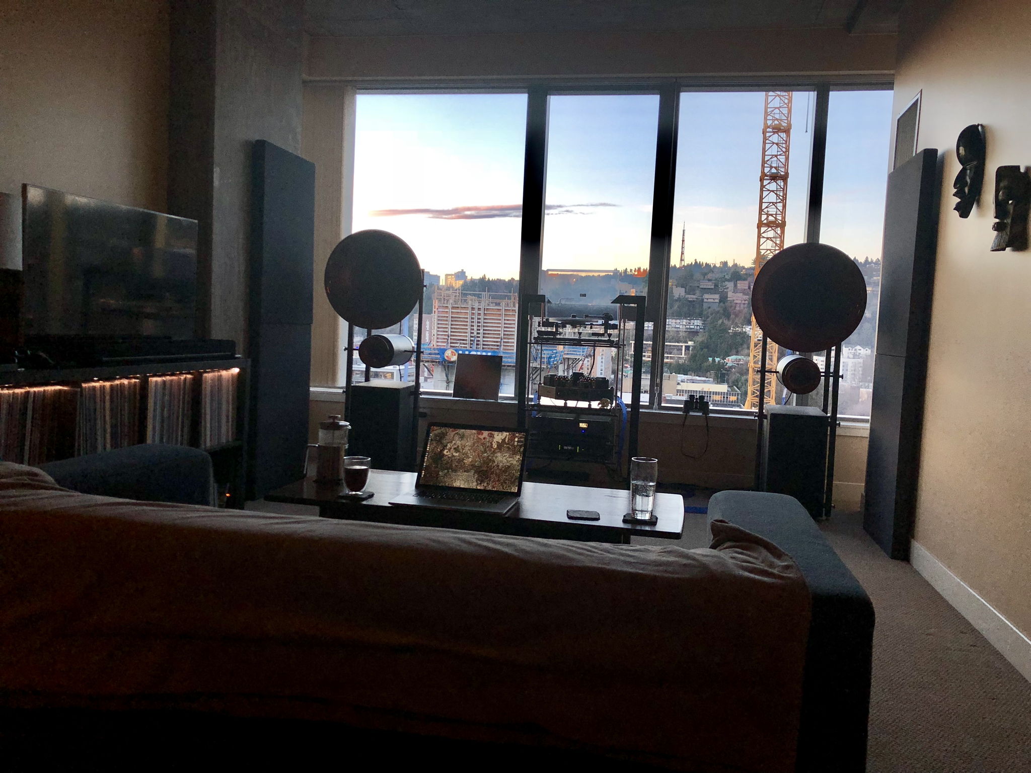 Beautiful system and room. The view must really enhance your enjoyment! I am currently obsessed with speaker distance and I am considering a front loaded horn. How far away do you listen and have you discovered any minimum distances for good sound with a front horn?