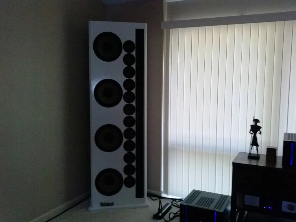 I built this system around the 1 of a kind Mcintosh XR-290 triple column line arrays in white that were Roger Russells personal system .