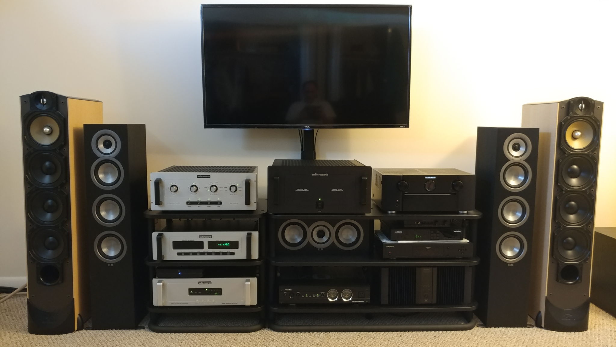 Two channel and home theater. The Paradigms are for two channel music driven by Audio Research. The Elacs are part of the surround system powered by the Marantz/Rotel combo. The Elacs are great sounding speakers and the center sounds just as good as the mains.