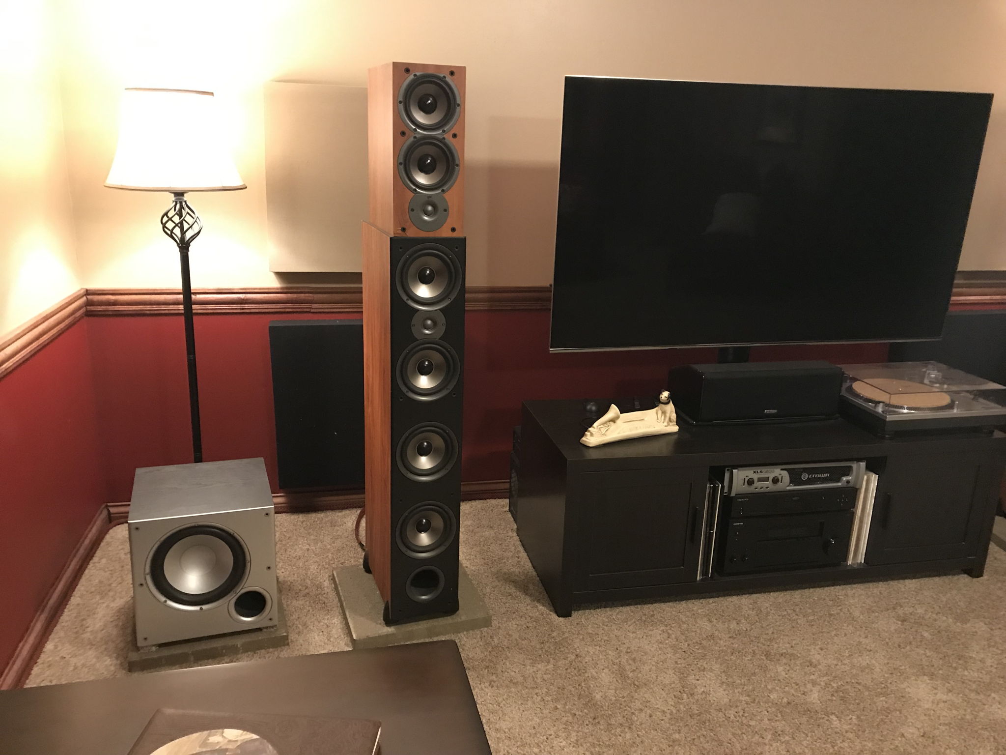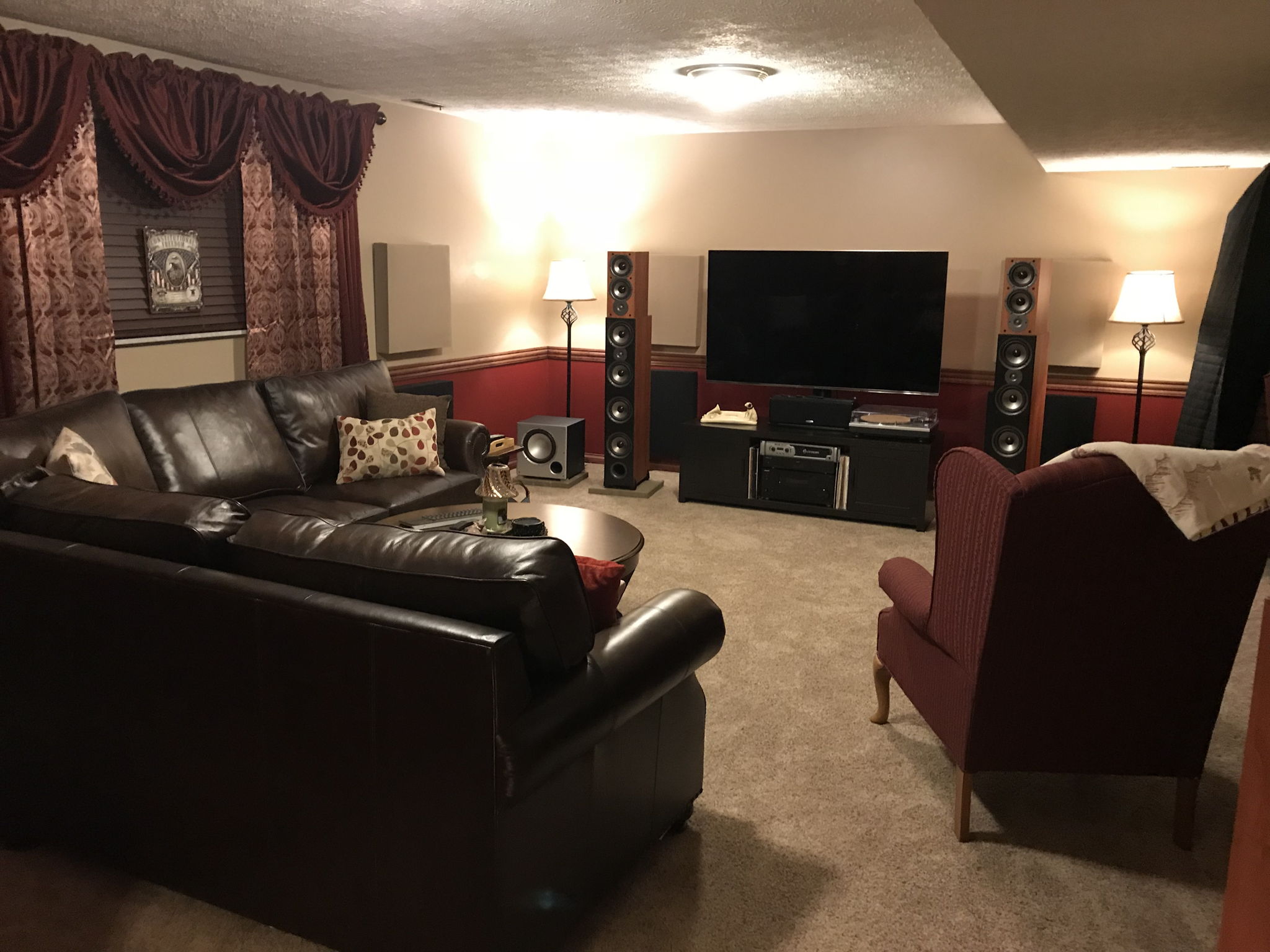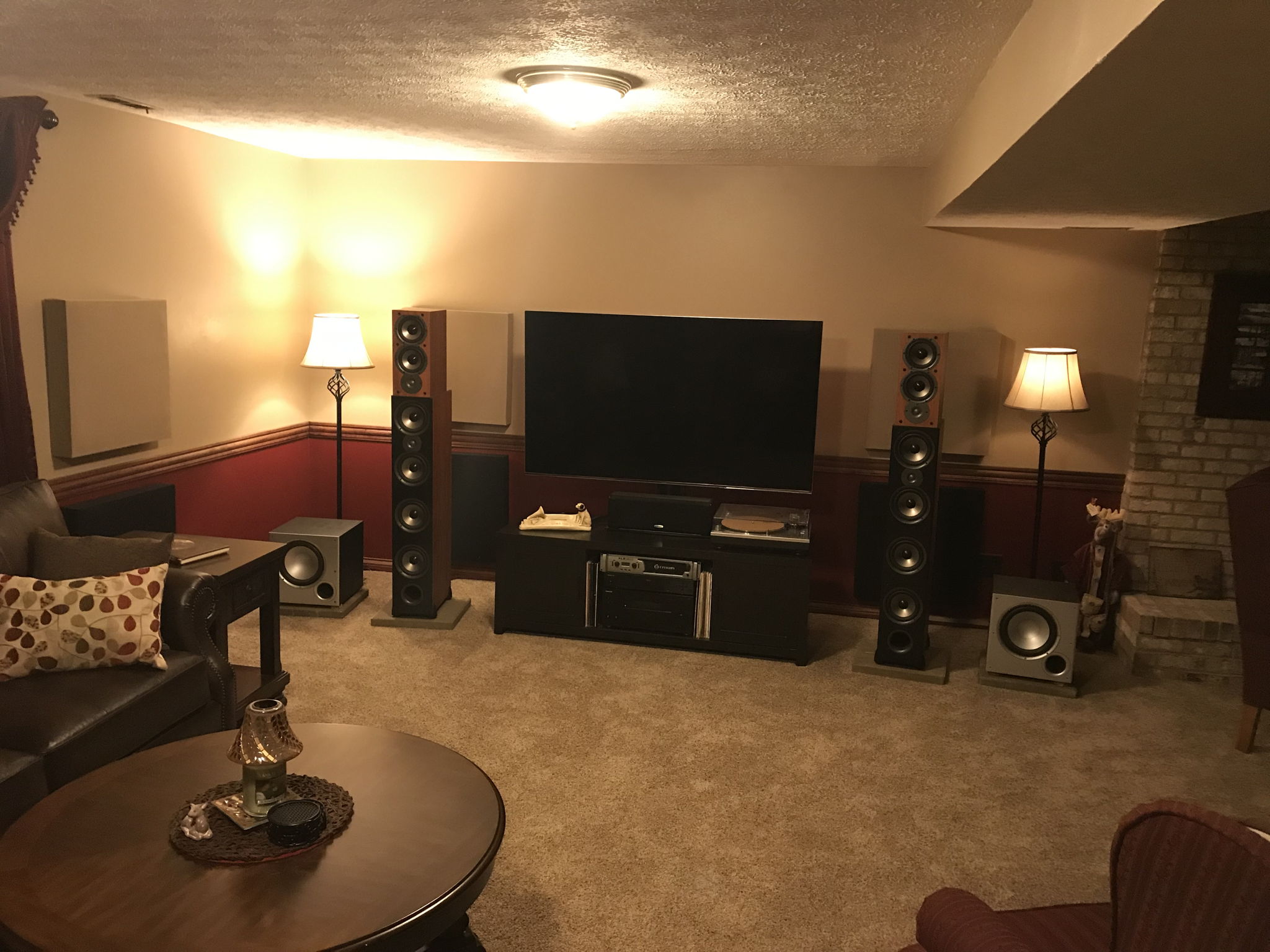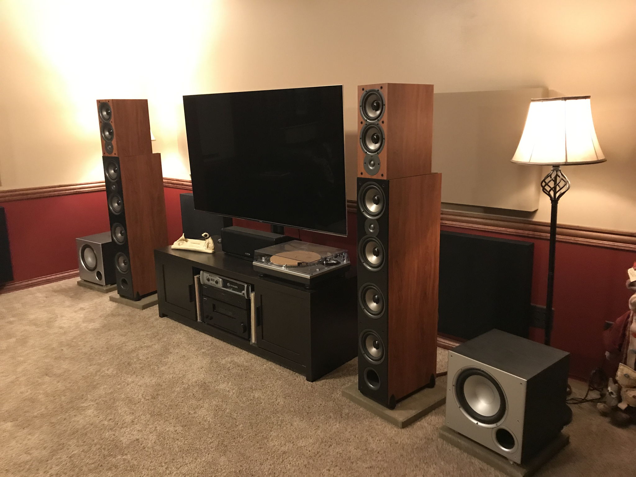 This is our Budget home theater system. After the kids move out, we completely renovated the down stairs from the capet to the furniture. That is the reason for the "Budget" on the components.